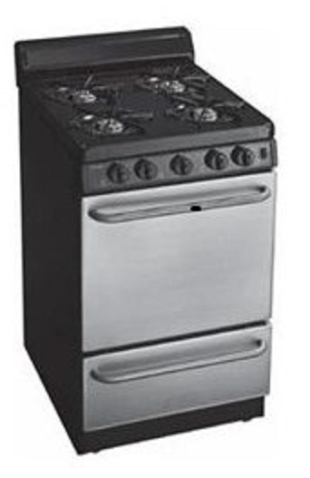 20" W freestanding gas range black with stainless steel panel front, 4 standard burners, and a storage drawer
