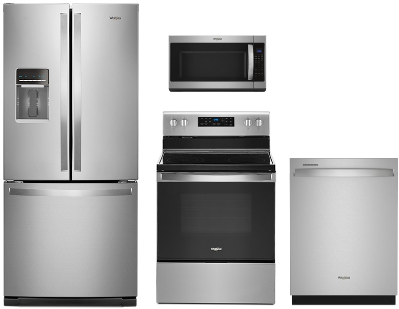Whirlpool® 4 Piece Fingerprint Resistant Stainless Steel Kitchen Package with a french door refrigerator, over the range microwave, built in dishwasher and free standing electric range.Read More
